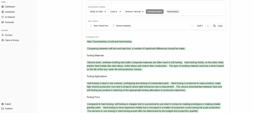 I found that using the humanizer in “strict” mode often tries too hard to outsmart AI detectors. Sentences may not make much sense and contain numerous grammatical errors.