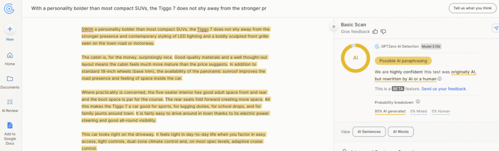 One useful function it has is an in-built AI checker, which I found to be pretty accurate – similar to GPTZero.