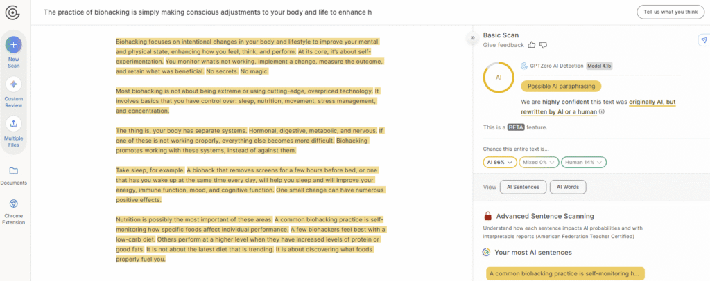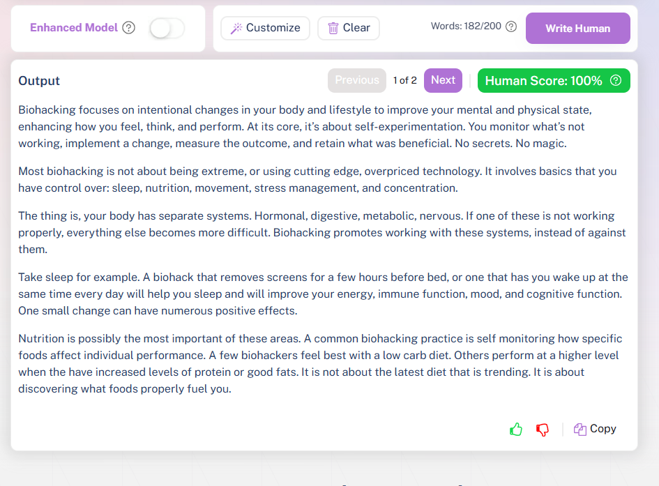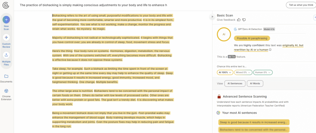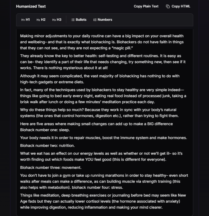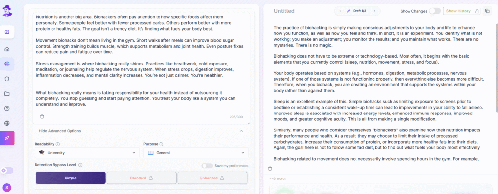The problem with this tool is that the higher you go with the bypass levels, the lower the quality of your content becomes, because it forces itself too much to evade AI detection. I found the “simple” bypass level to be the most effective in both bypassing and quality.