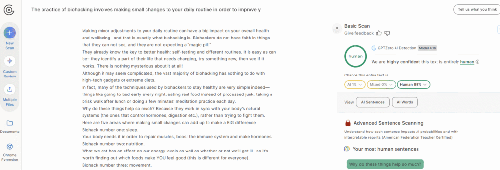 No. After conducting several tests, I was unable to bypass the GPTZero detector. This was true even when using the “GPTZero Mode” on their platform. Therefore, if you need content that can bypass the GPTZero AI detector, you will need to look into a Grubby.ai alternative.