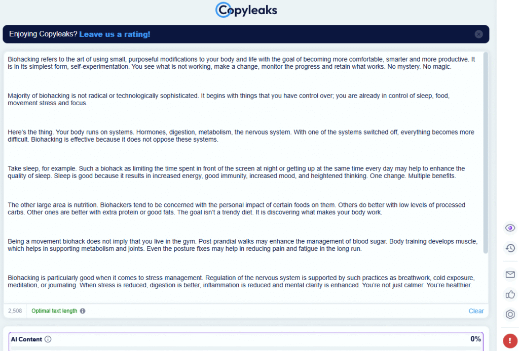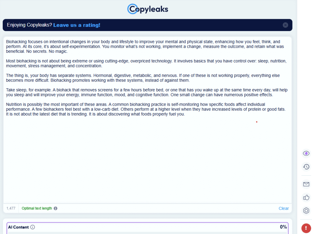 From the screenshots below, it’s visible that ReHumanize AI can bypass Copyleaks and GPTZero.