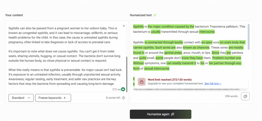 It is important to note that while you can humanize up to 1,200 or 3,000 words at a time with this tool, the longer the content pieces you try to humanize, the lower the quality of the content will be. In fact, we found that the quality became quite bad and contained a lot of hallucinations.